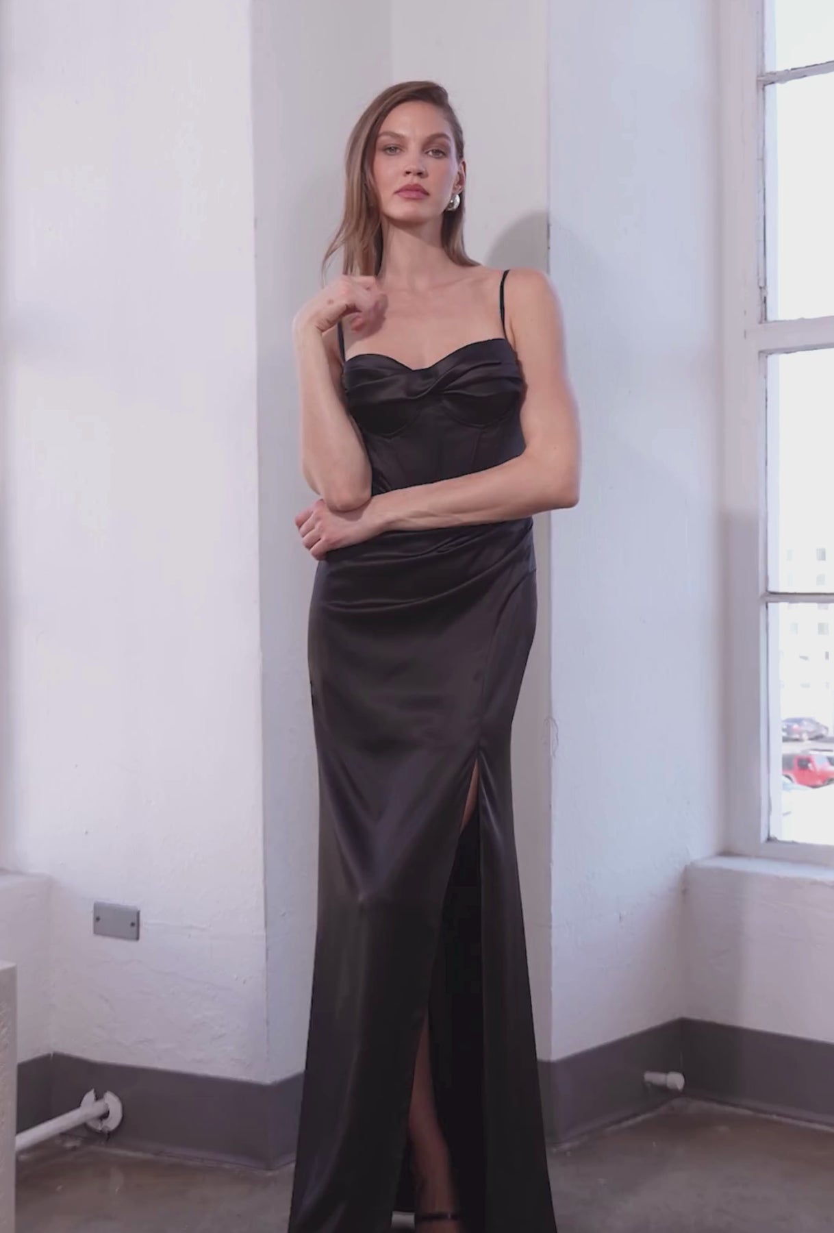 This sultry corset-style gown offers a stunning blend of structure and elegance, perfect for making a statement at any special occasion. Crafted from luxurious satin, the gown features a fully boned bodice that sculpts and supports, while thin straps add a delicate, refined touch. A unique twist drape neckline sets this gown apart, creating soft dimension and a modern focal point. Designed to flatter, the fitted silhouette highlights your curves, and a daring thigh-high front side split adds just the right amount of edge. Sophisticated and stylish, this satin gown is your go-to for formals, weddings, or evening events.