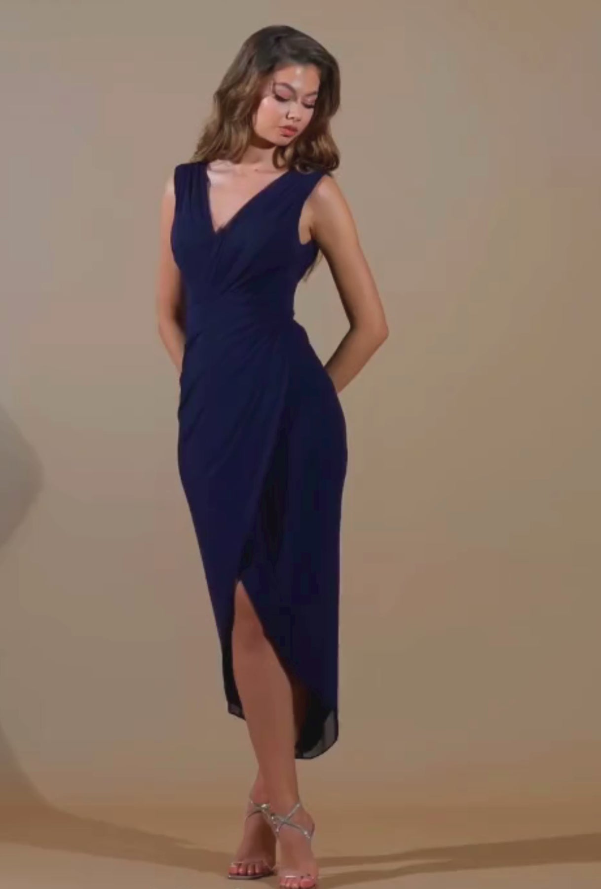 This stunning midi dress is crafted out of a stretch lycra mesh and features a crossover style front with gather detailing, boned bodice and drape detail, crossover tulip style high/low skirt.