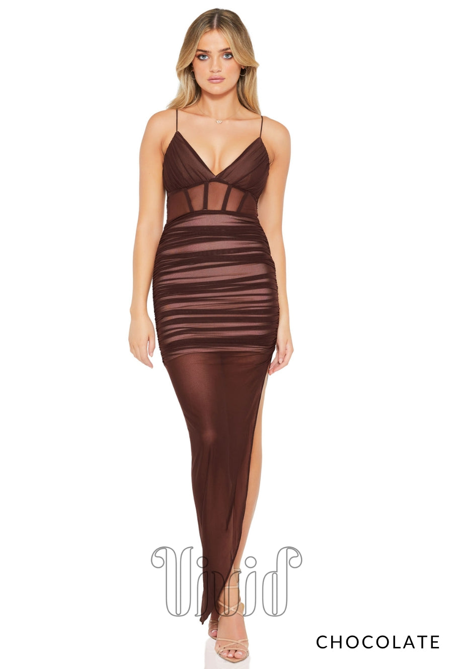 This slinky mesh gown with a nude underlay features flattering ruching, striking sheer panels in the bodice & a sexy side split with a mini length lining. PROUDLY DESIGNED AND MADE IN AUSTRALIA
