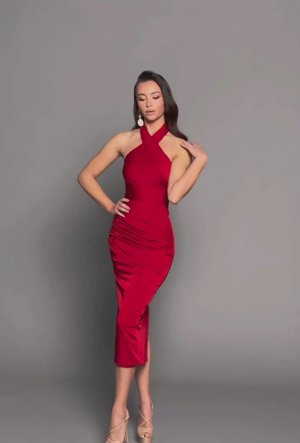 This sleek and sophisticated fitted halter neck midi dress is the perfect blend of understated elegance and modern style. The timeless halter neckline enhances the shoulders and neckline, while subtle gathering on the bodice and skirt creates a flattering, tailored fit that beautifully highlights your shape. The streamlined silhouette offers a sleek, polished look, making it ideal for both formal events and more intimate occasions. This dress radiates effortless charm and refined simplicity, ensuring you make a stunning impression wherever you go.