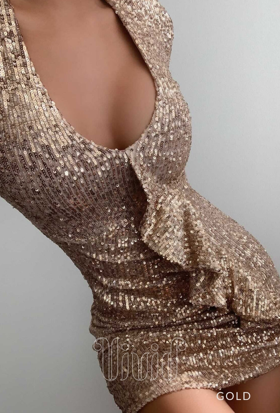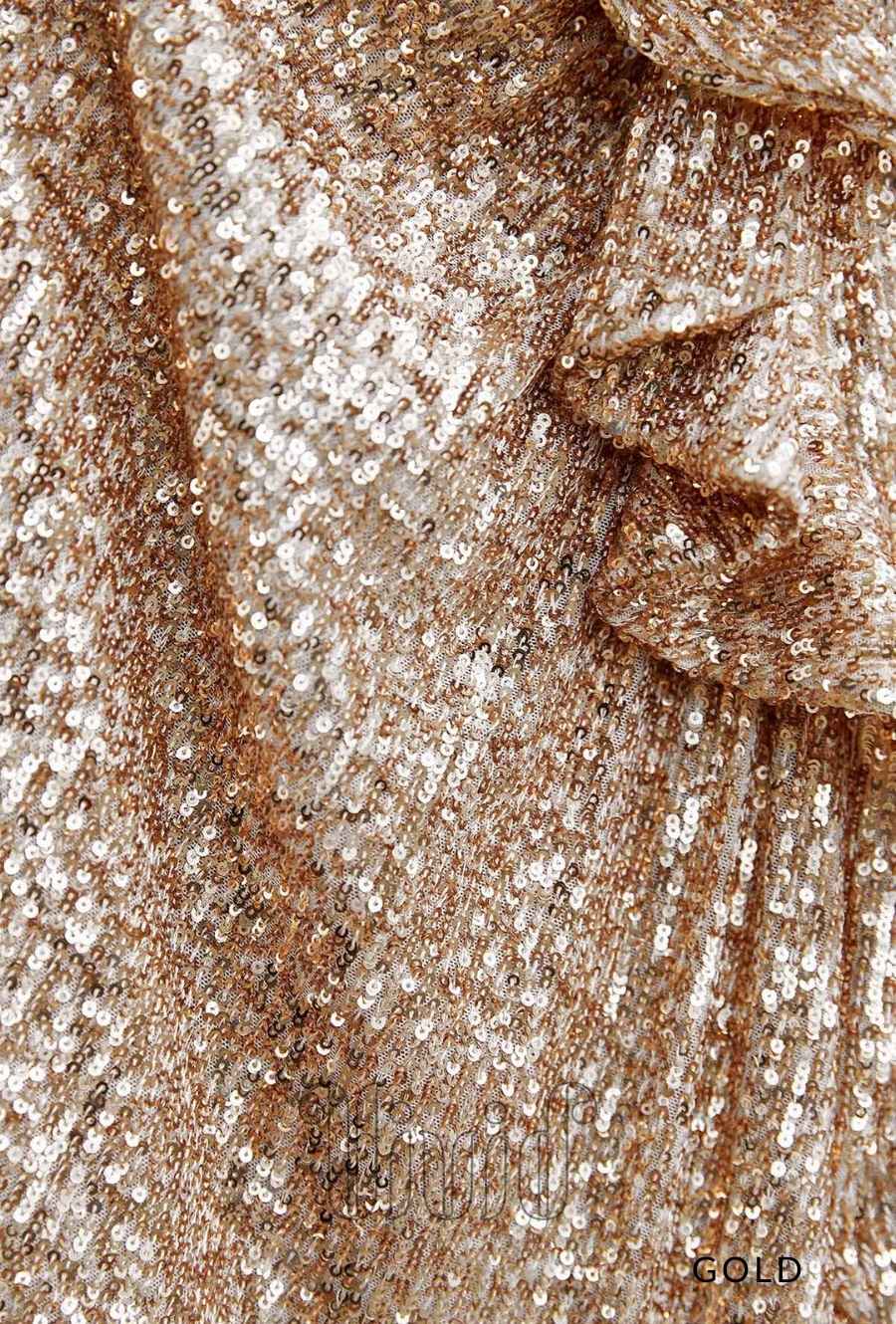 This bombshell mini dress with flattering ruched front and asymmetrical frill detail is crafted from a super stretch, stripe sequin and is fully lined. The dress features shoulder pads. Invisible zipper at centre back with rose gold Nookie puller. PROUDLY DESIGNED AND MADE IN AUSTRALIA.