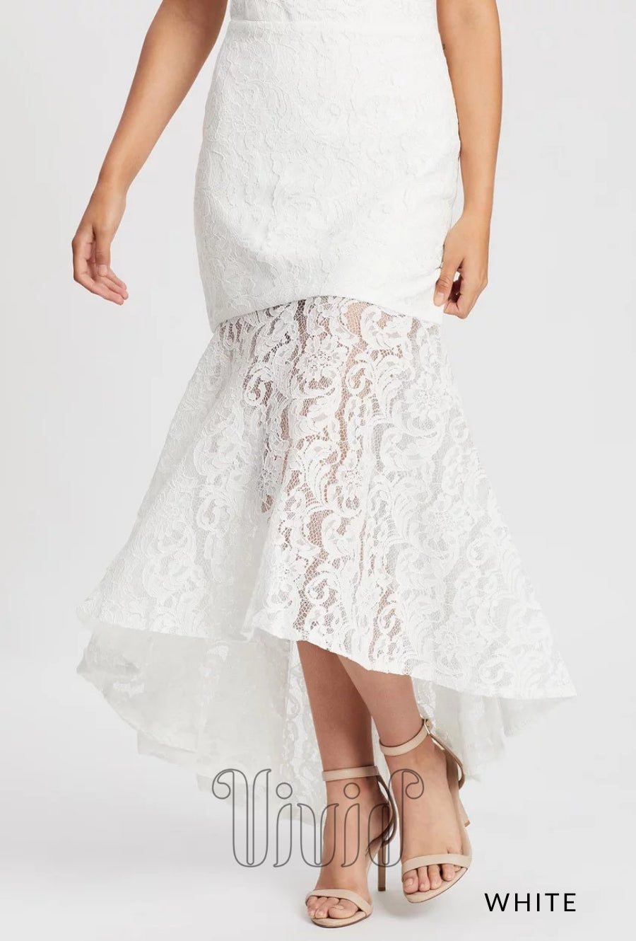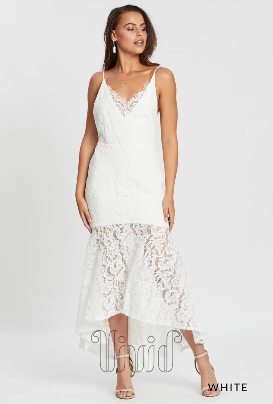 This stunning fitted midi dress is crafted from a premium mid weight woven fabric with lace overlay and slight stretch and features a V-shaped neckline with sheer paneling and fitted high/low silhouette with a sheer flounce fluted skirt. The dress also features adjustable racerback straps.