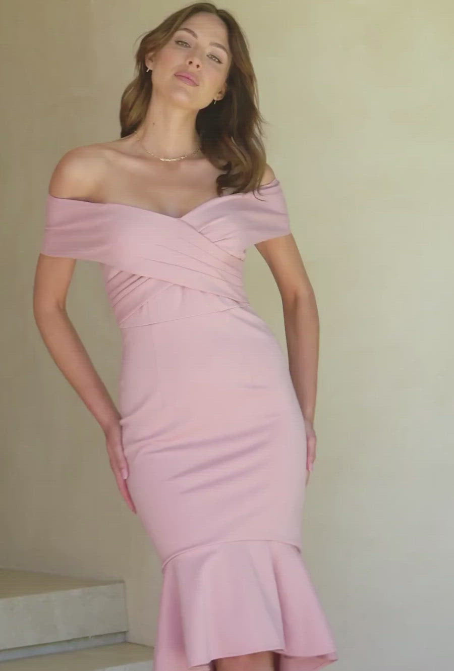 All eyes on you in the Brienne Dress. Featuring a flattering off the shoulder neckline with wrap detail, cinched waist and a fishtail style hem. This best selling midi dress is the perfect wardrobe addition for classic event wear glam.