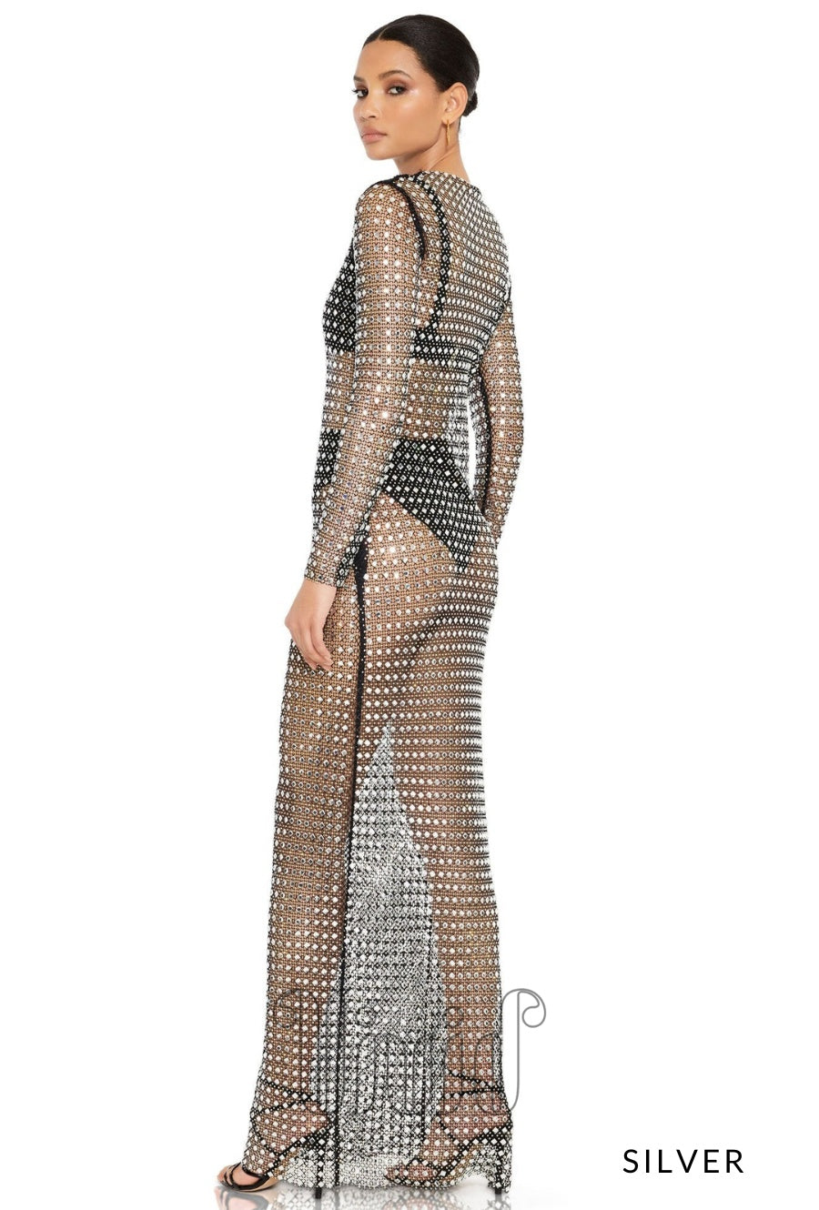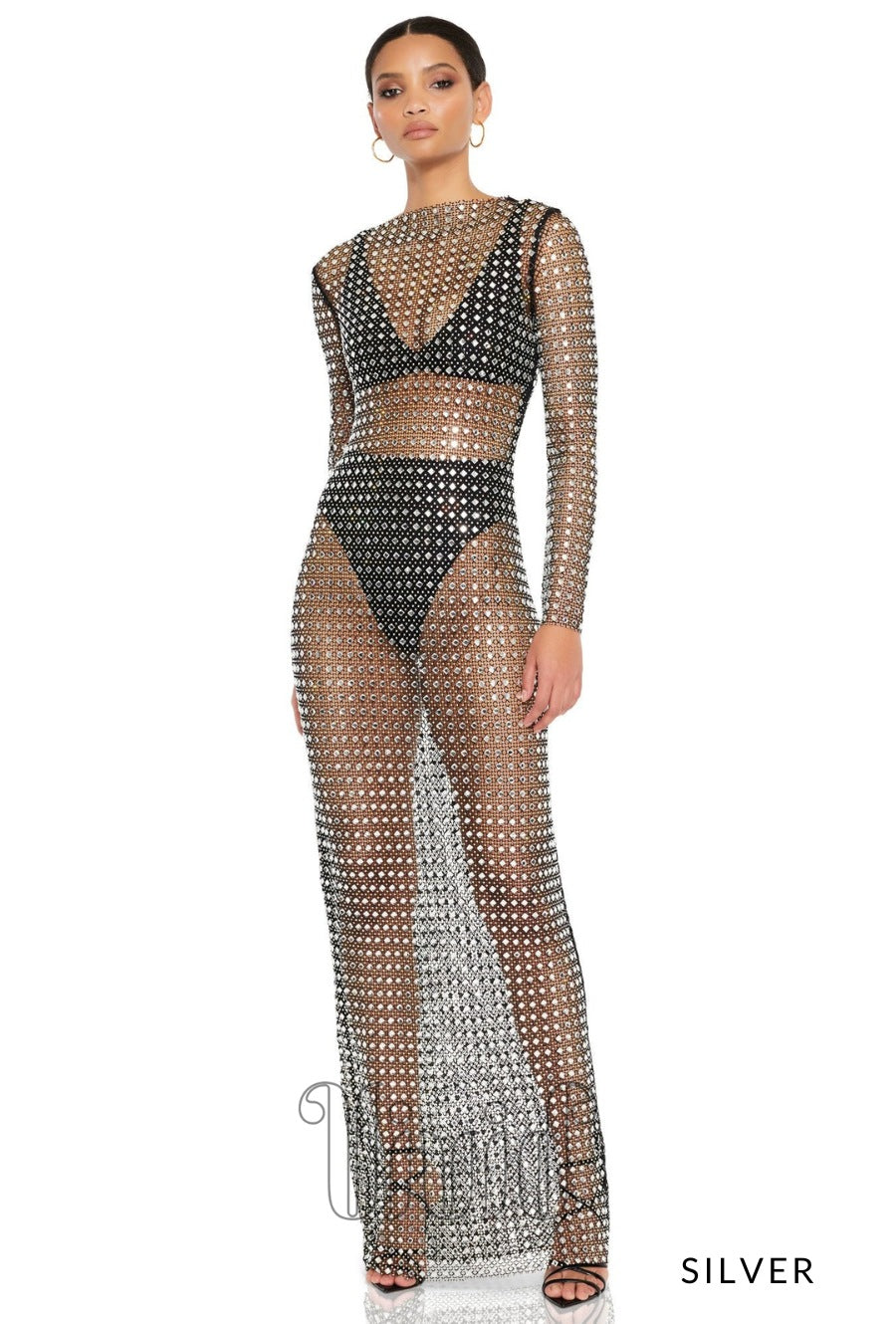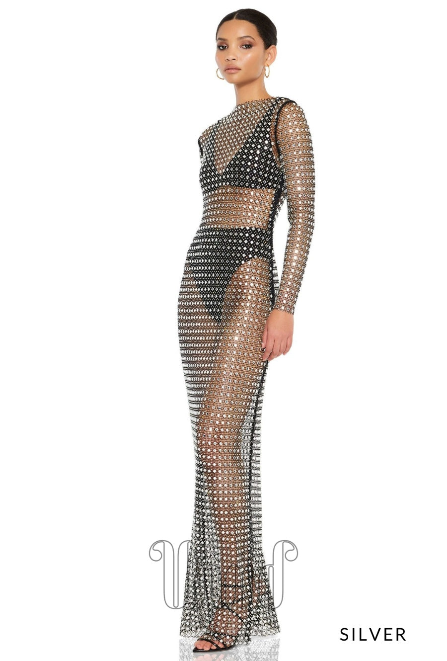 This show stopping sheer gown is made for the magic moments. This gown is crafted from a glittering diamanté fabric with a high neck & long sleeve and has a zip closure at the side. Each garment is unique and placement of stones vary between each piece. This garment is delicate, please remove all jewellery and take care when trying it on to avoid damage.