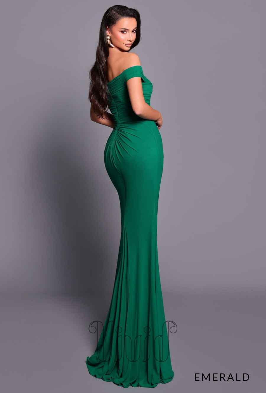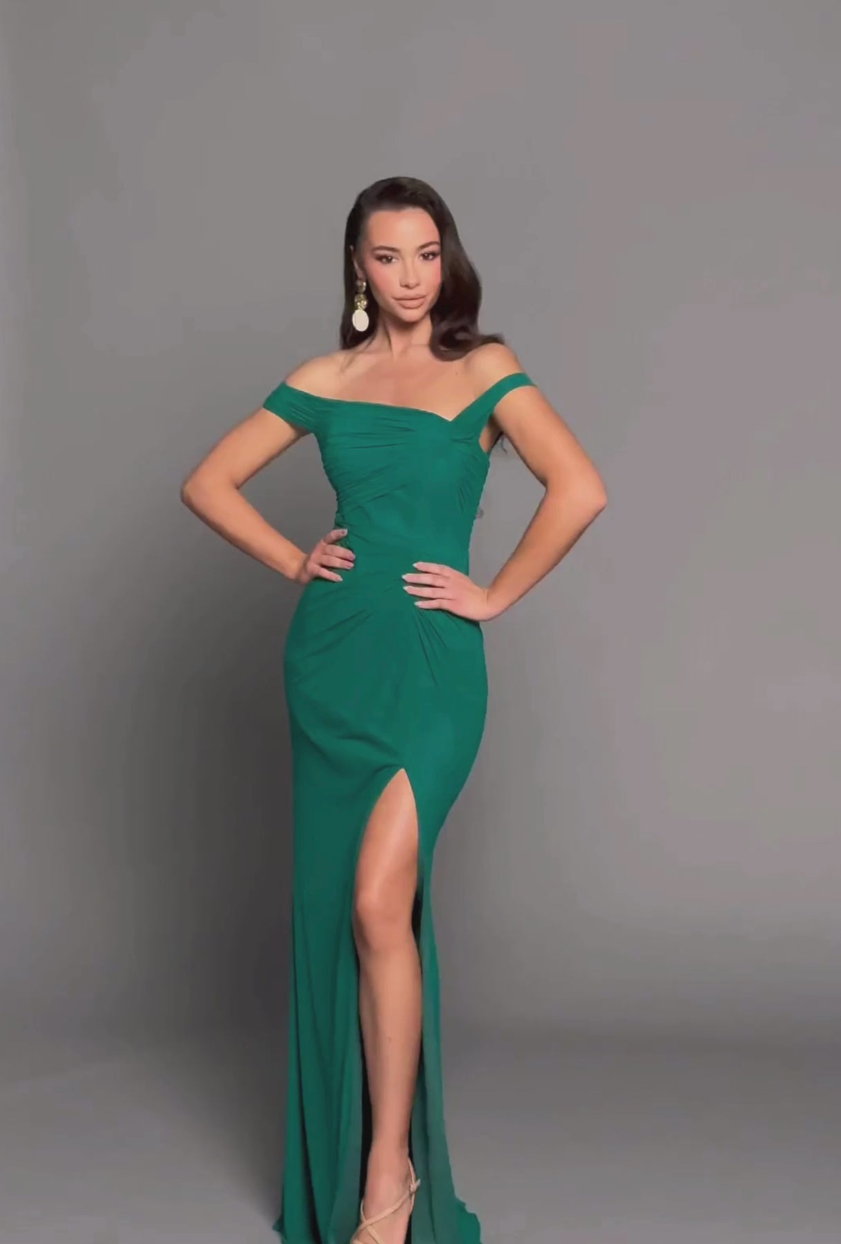 This stunning stretch lycra mesh gown effortlessly combines classic sophistication with modern elegance. Featuring an asymmetric off-the-shoulder design with gather twist detailing, it offers a chic and flattering silhouette. The fitted shape beautifully contours your figure, with flattering gathering on the front and back to enhance your curves. A daring thigh-high front side split adds a bold touch, allowing for ease of movement and a striking, dramatic effect. The sleek, fitted skirt completes the look, offering a sleek and sophisticated finish. Perfect for formal occasions, weddings, or as a stylish bridesmaid dress, this gown exudes timeless beauty and refined allure.