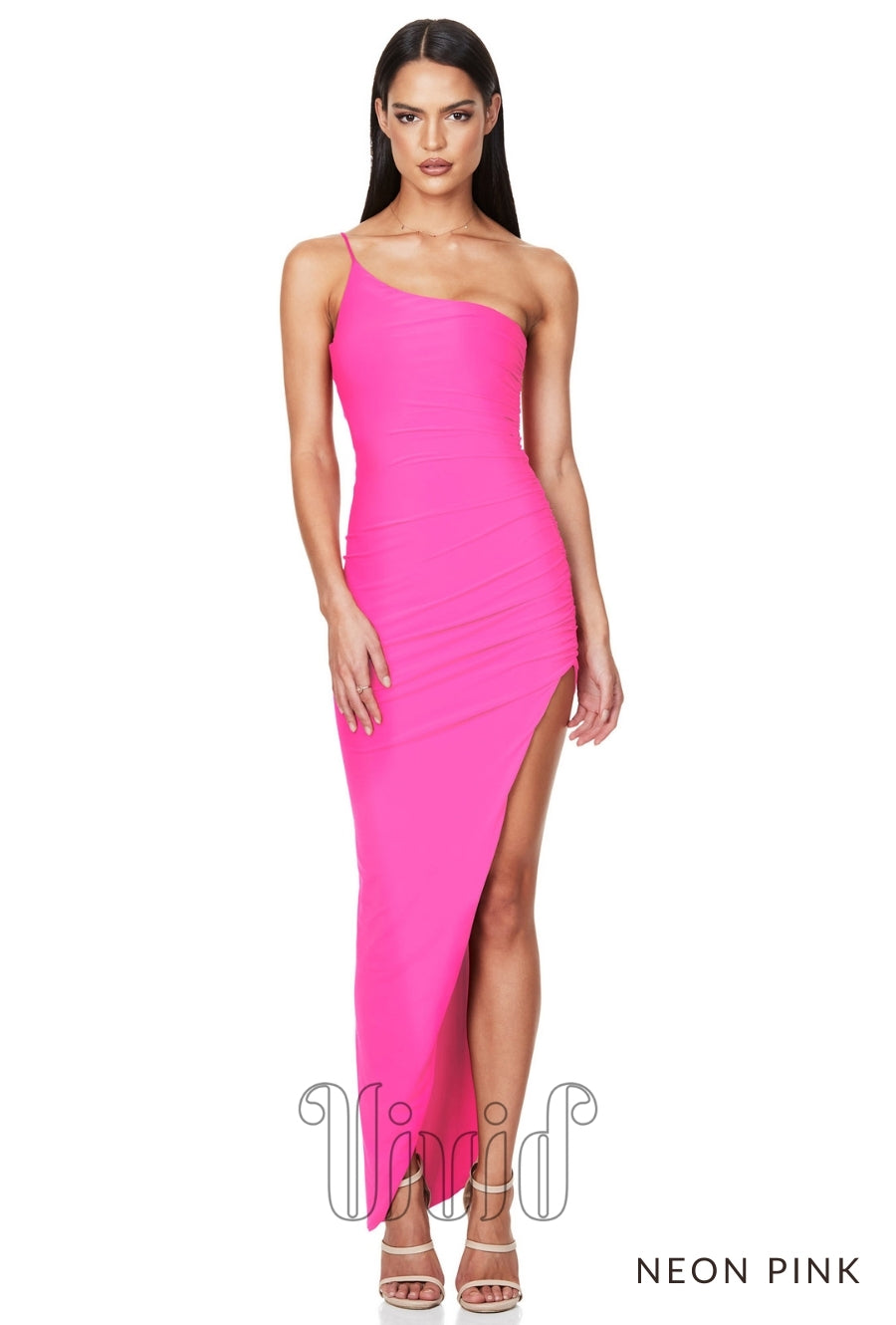 This simple and striking asymmetrical gown is crafted from a soft jersey and features side gathers and a sexy thigh high split. The dress is fully lined and has a rose gold invisible zipper. PROUDLY DESIGNED AND MADE IN AUSTRALIA.