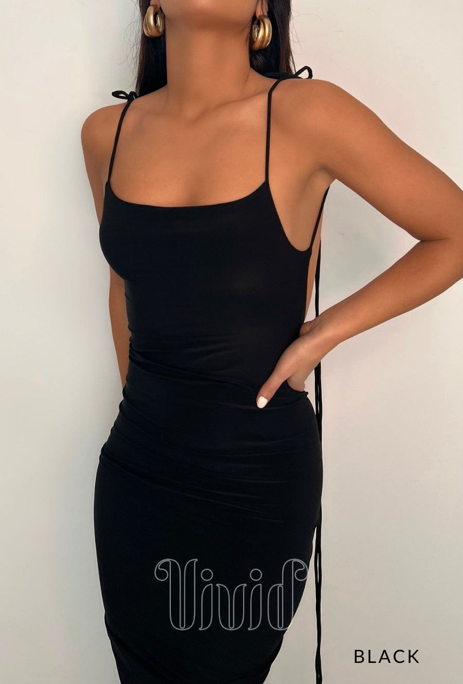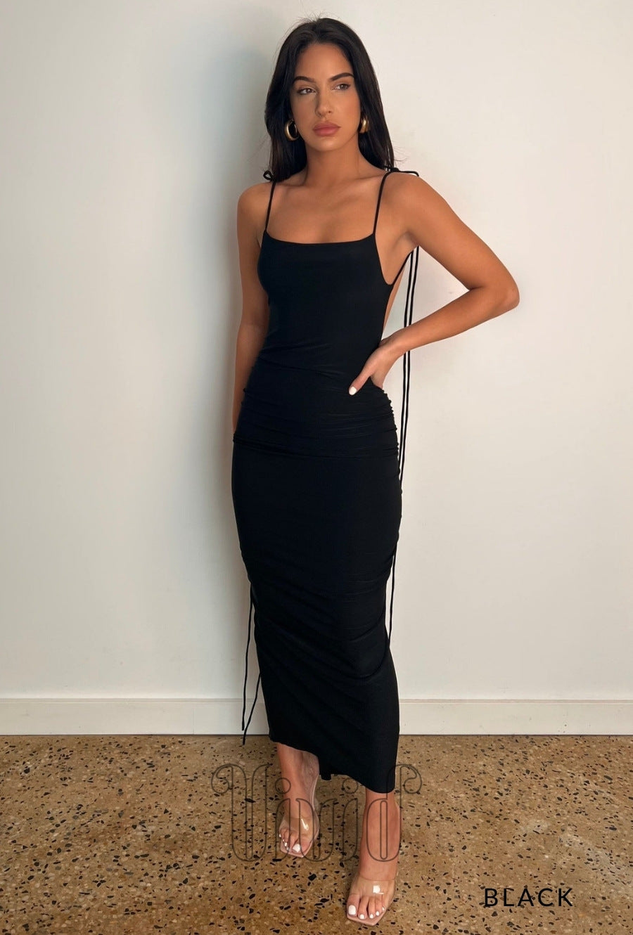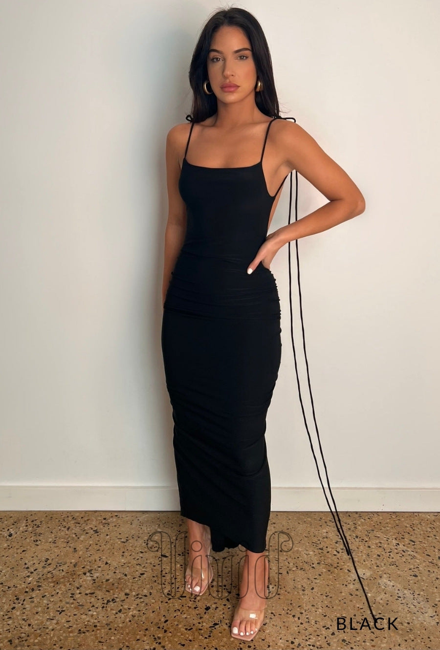 This stunning dress is crafted from 2 layers of high quality stretch jersey fabric and features elongated strings and gathered back detail. This super flattering design also features an ultra low back & a classic neckline. The Azari Midi is a show stopper!