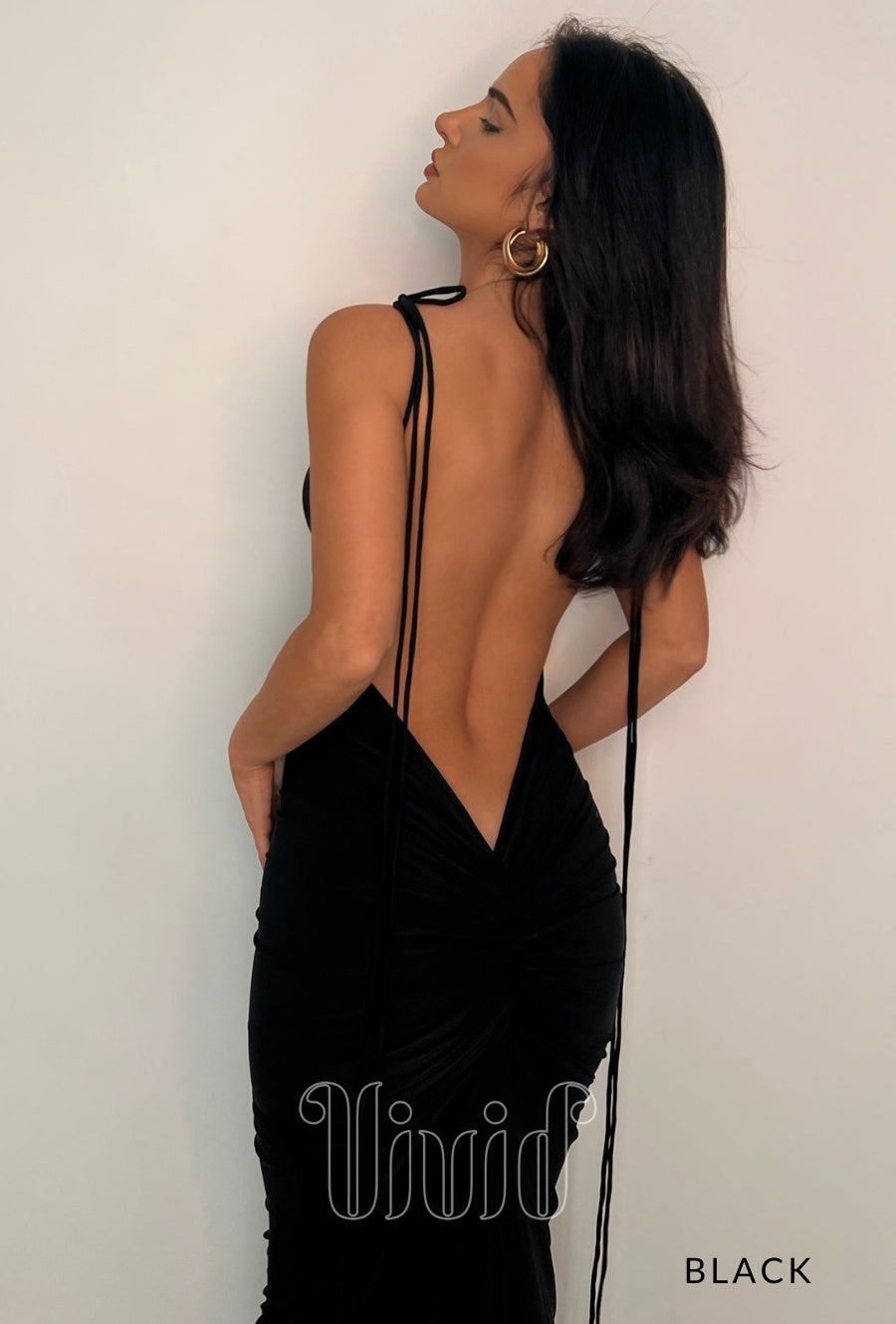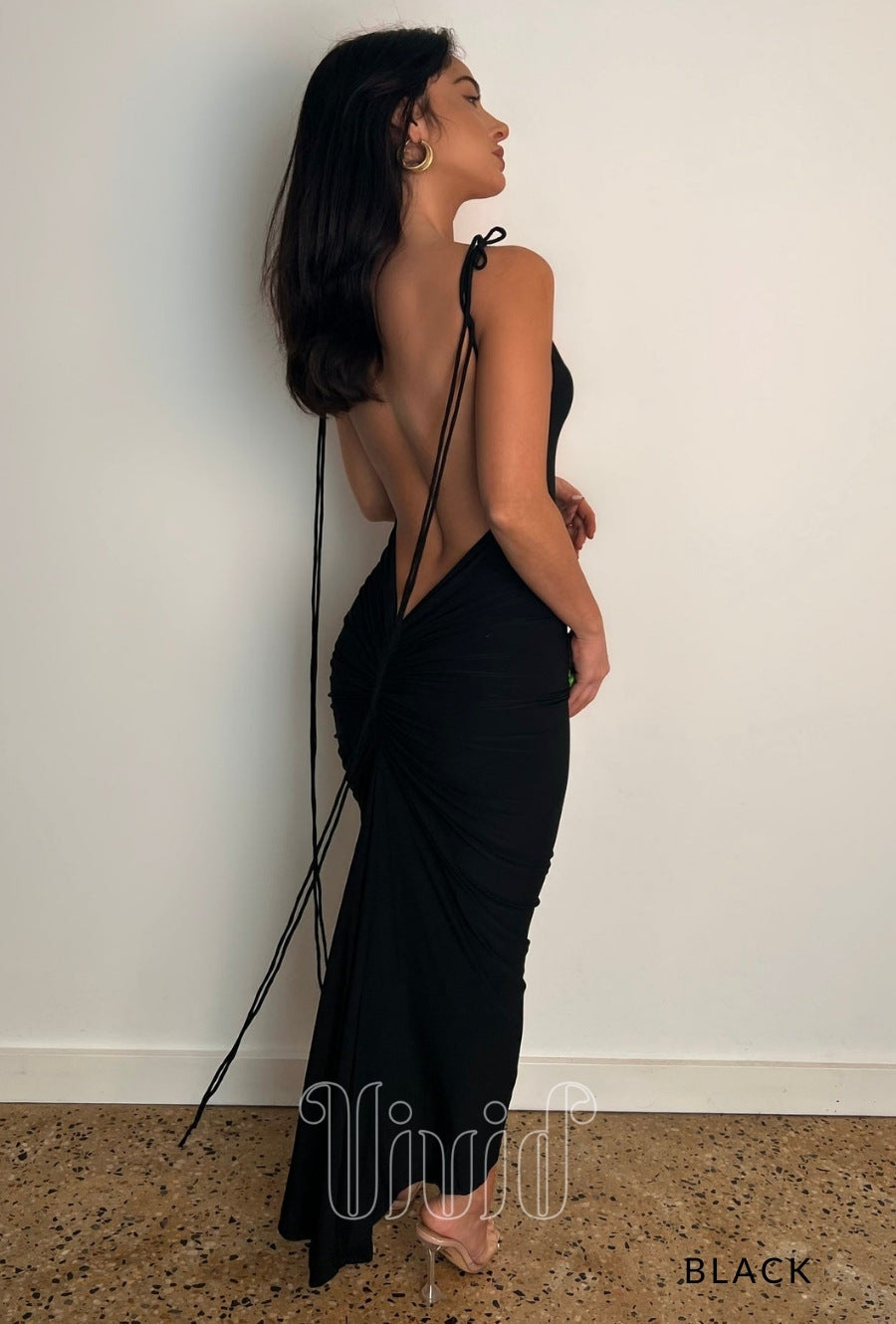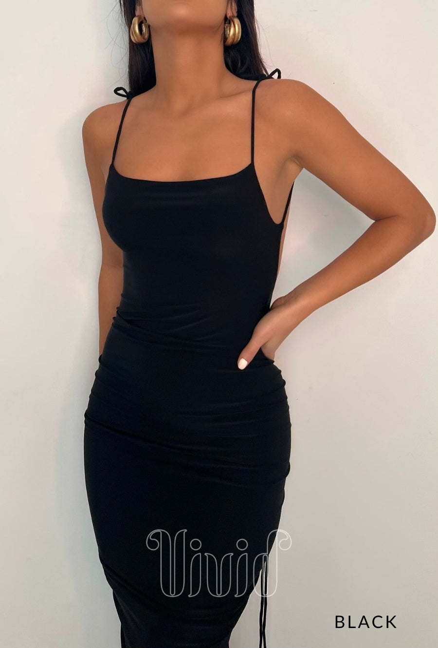 This stunning dress is crafted from 2 layers of high quality stretch jersey fabric and features elongated strings and gathered back detail. This super flattering design also features an ultra low back & a classic neckline. The Azari Midi is a show stopper!