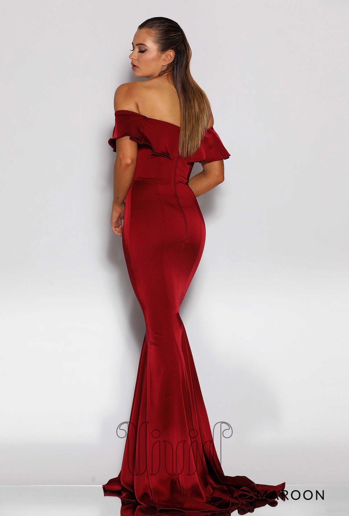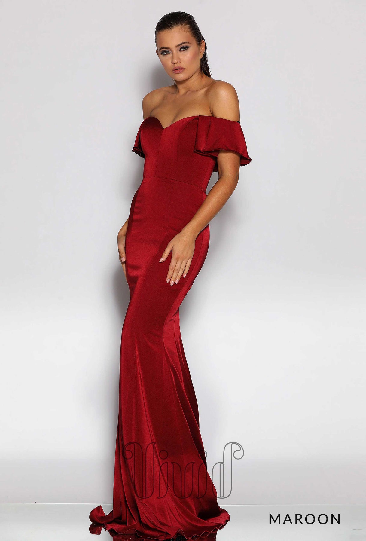 This incredible off the shoulder fitted floor length evening gown features ruffled off the shoulder sleeves, a fully boned sweetheart bodice and mermaid style skirt with small train.