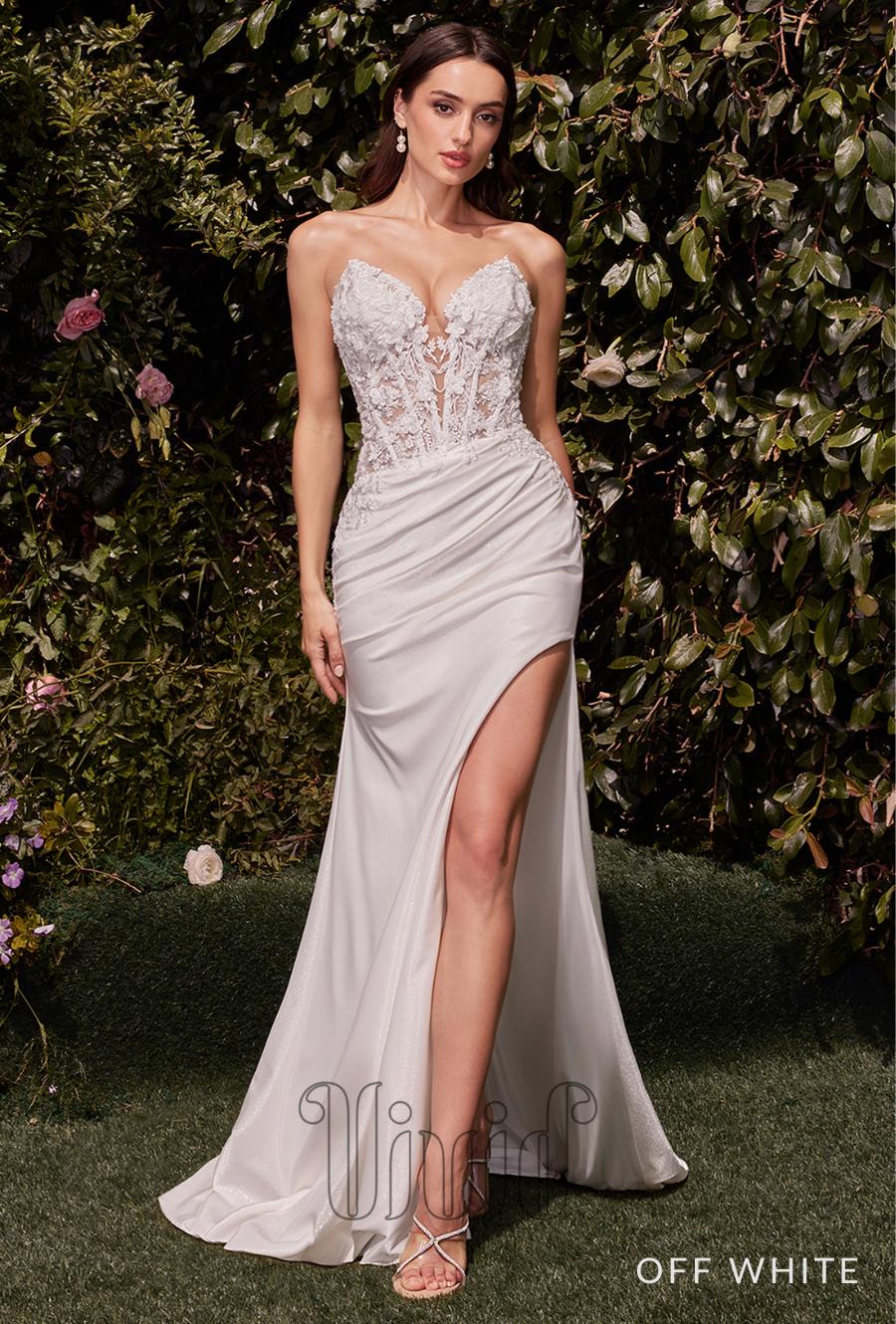 This stunning strapless fitted bridal gown will have you looking like an absolute vision on your special day! The fitted silhouette elegantly flatters your figure, while the lace-appliqued bodice adds a touch of romantic sophistication. The sheer boned bodice provides comfortable support, showcasing just the right amount of skin for a subtly alluring look. Made from iridescent shine satin, this gown catches the light beautifully, giving you a luxurious, radiant appearance as you walk down the aisle. A tasteful leg slit adds a hint of modern allure, perfect for the most glamorous of weddings. Whether you're celebrating on a beach or an intimate setting, this gown ensures all eyes will be on you.