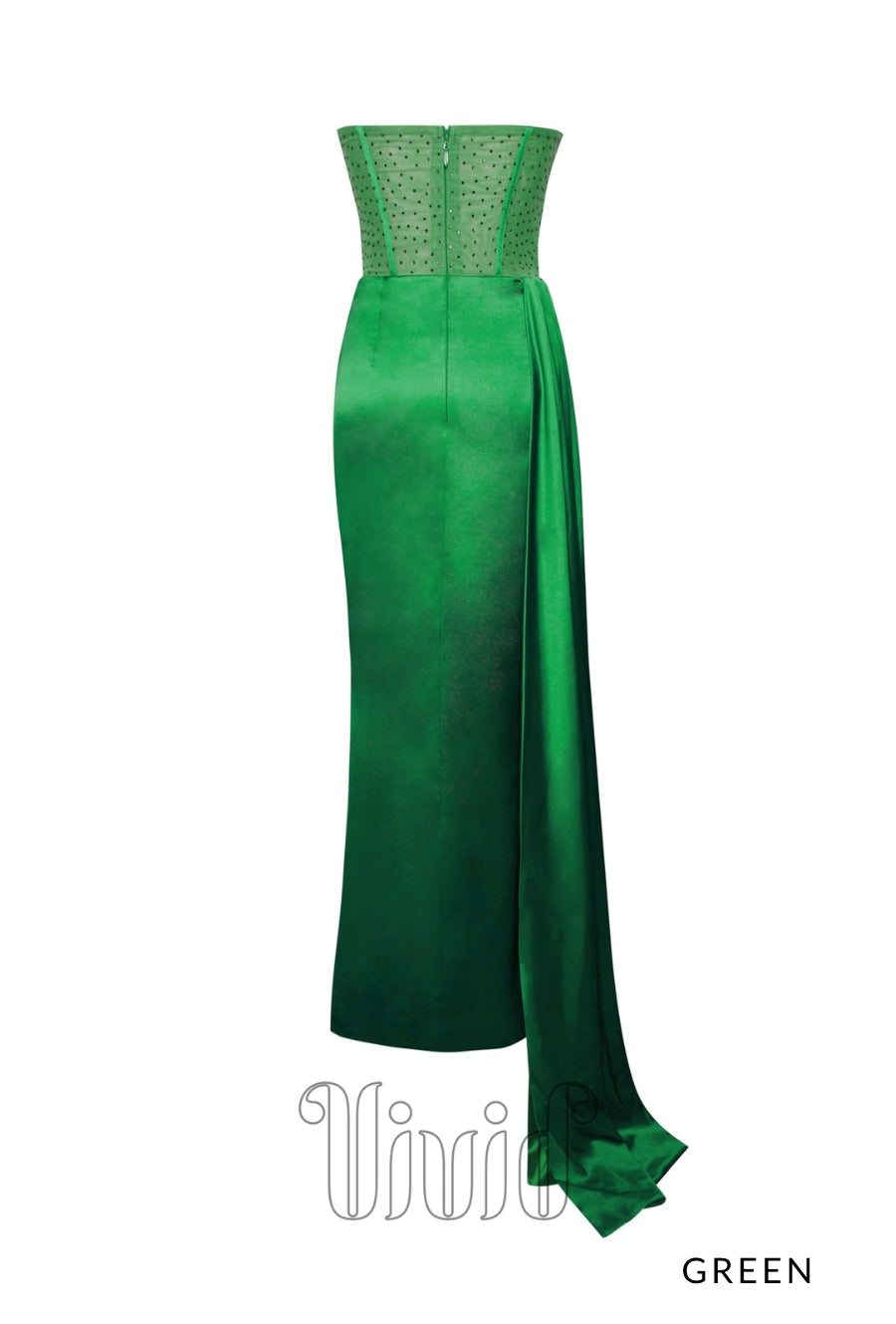 Words can not begin to describe this Vivid Formal favorite. This incredible gown is crafted from a rich satin and features a strapless mesh boned corset bodice that flows effortlessly into a draped skirt. This gown was designed for any black tie occasion. The gown also features a thigh high split.