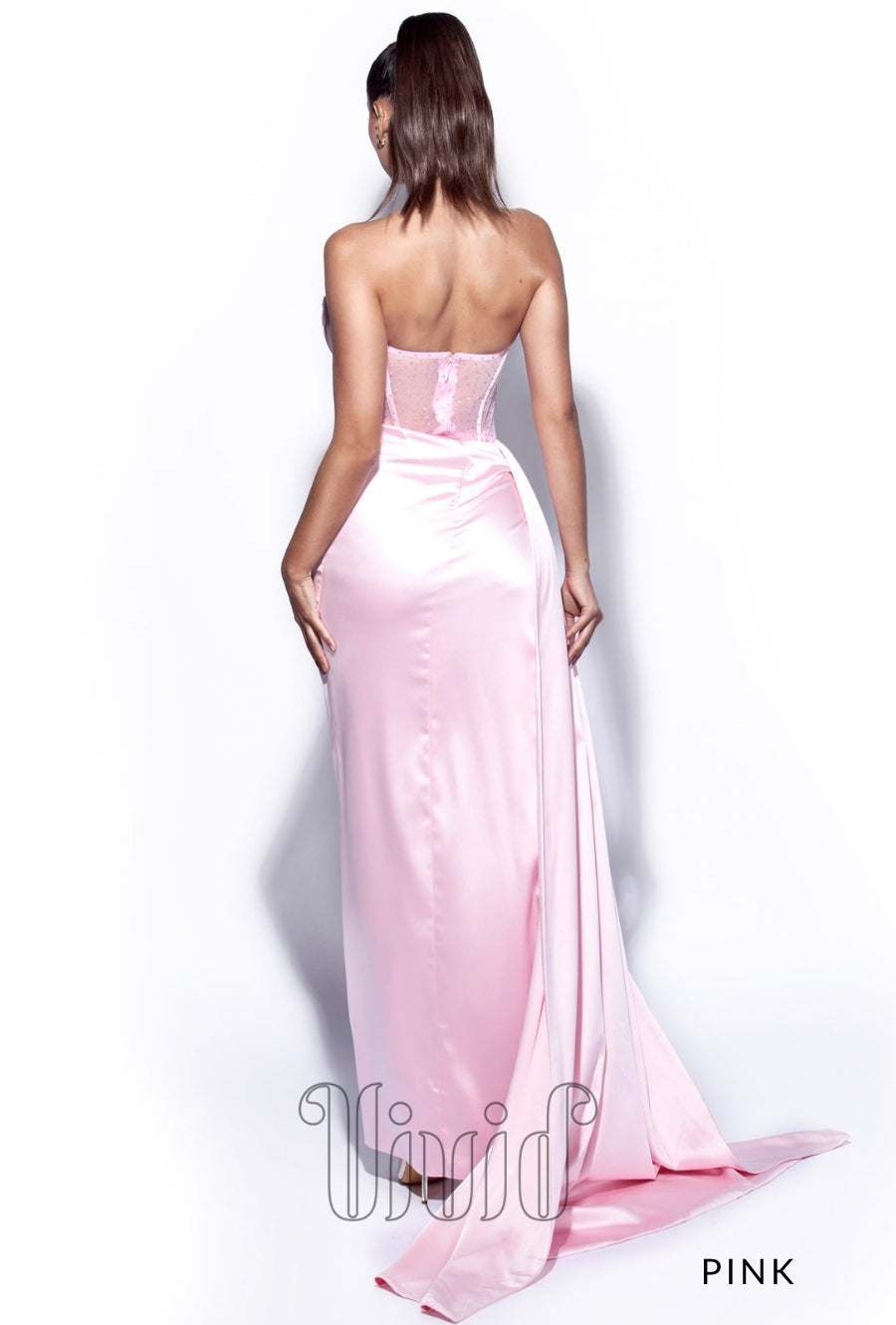 Words can not begin to describe this Vivid Formal favorite. This incredible gown is crafted from a rich satin and features a strapless mesh boned corset bodice that flows effortlessly into a draped skirt. This gown was designed for any black tie occasion. The gown also features a thigh high split.