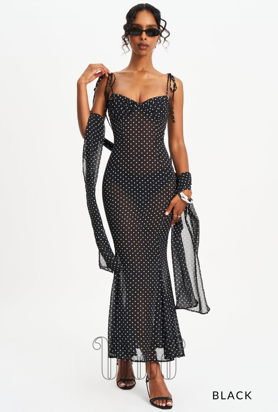 Elegance meets charm in the Evie Dress — a flowing maxi silhouette crafted in sheer chiffon with a polka dot print. Designed with adjustable straps and a flattering ruched bust, this mermaid-style dress features an invisible zipper for a seamless finish. Fully lined for comfort, it also comes with a matching chiffon scarf, making it the perfect look for romantic evenings, destination weddings, or sunset dinners.